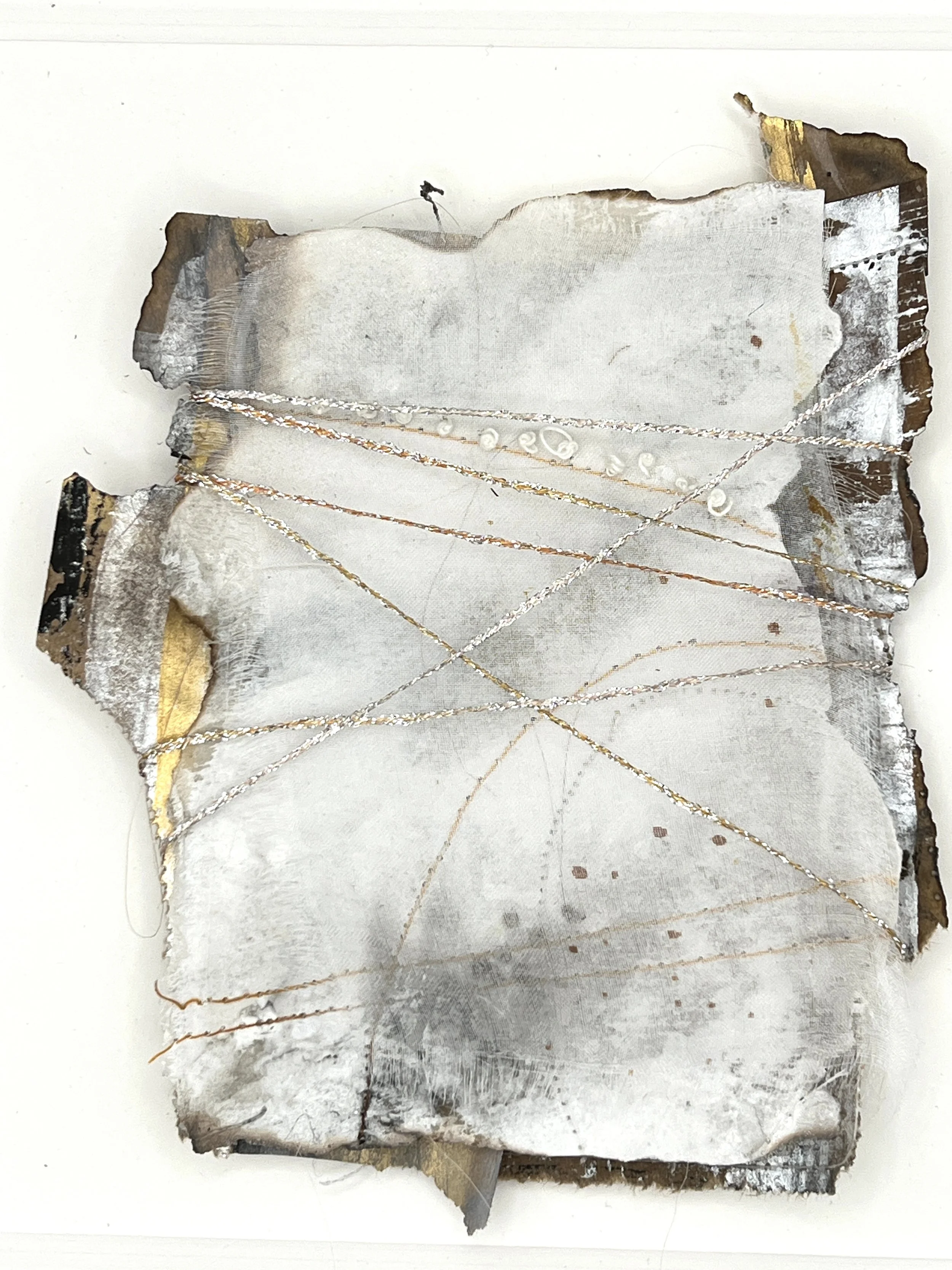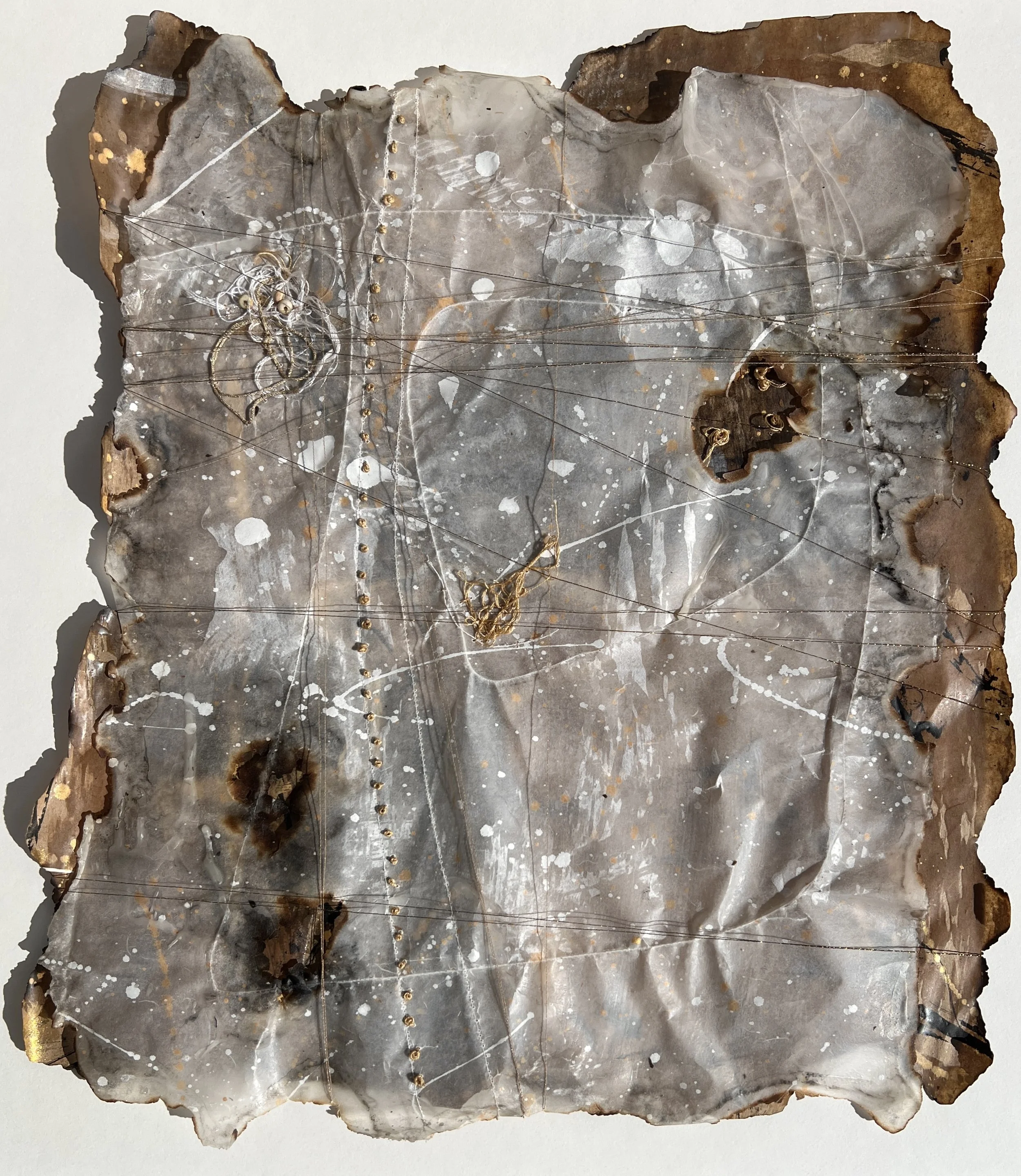 I add more of the washi paper doused in encaustic medium and white acrylic paint to bring a lightness and translucency that feels like the cosmos. . . eternal. As are we.