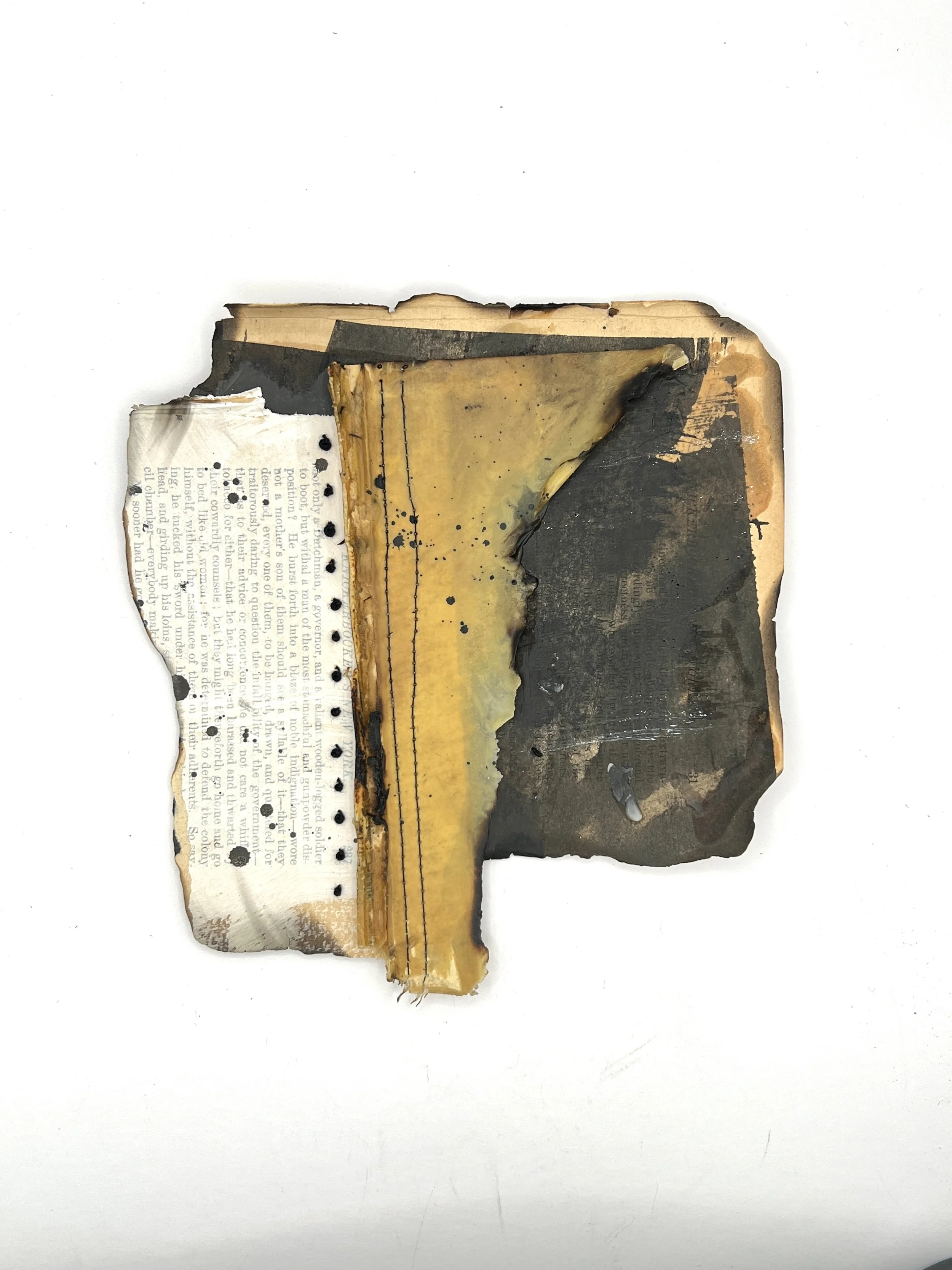 I paint some of the pages with gesso; it makes a rougher, earthier texture than acrylic. Others are dyed with India ink, and some are splattered with encaustic. I use machine stitch to hold them together, often add touches of hand stitch, burn the edges, and often apply a coat of matte varnish for strength and endurance.