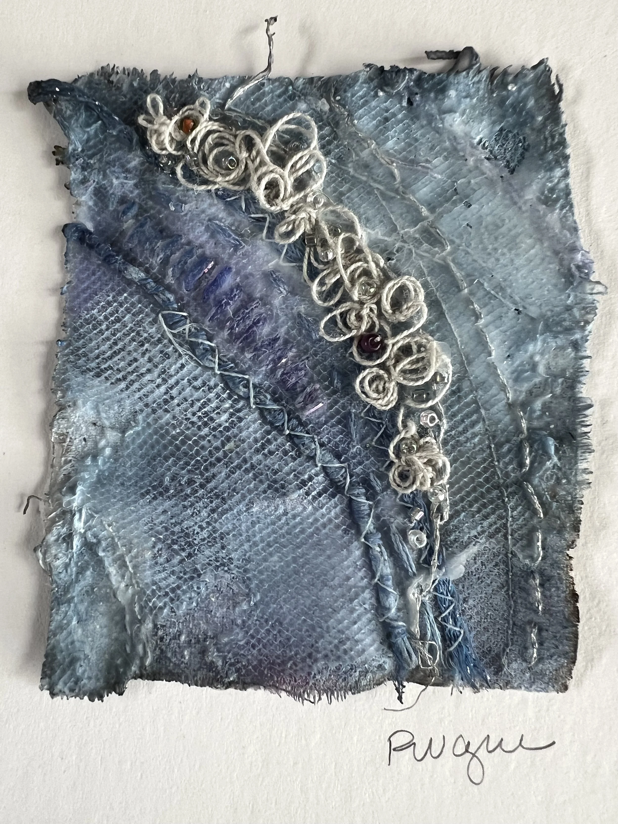 One of the first pieces I made on a textile, maybe 10 or 12 years ago, was a 12” by 12” square of canvas. I was thinking about the night sky when I worked on it. I did intensive stitch - couching, machine - all sorts. It didn’t hang together as a finished piece but I kept it all these years because of the fun I had while learning to stitch. I tore it up, added some watered down acrylic, maybe added some beads, more stitch, and coated the piece in beeswax. Pieces are small – between 2” and 3.5”. Each piece is $120 which includes shipping and tax.